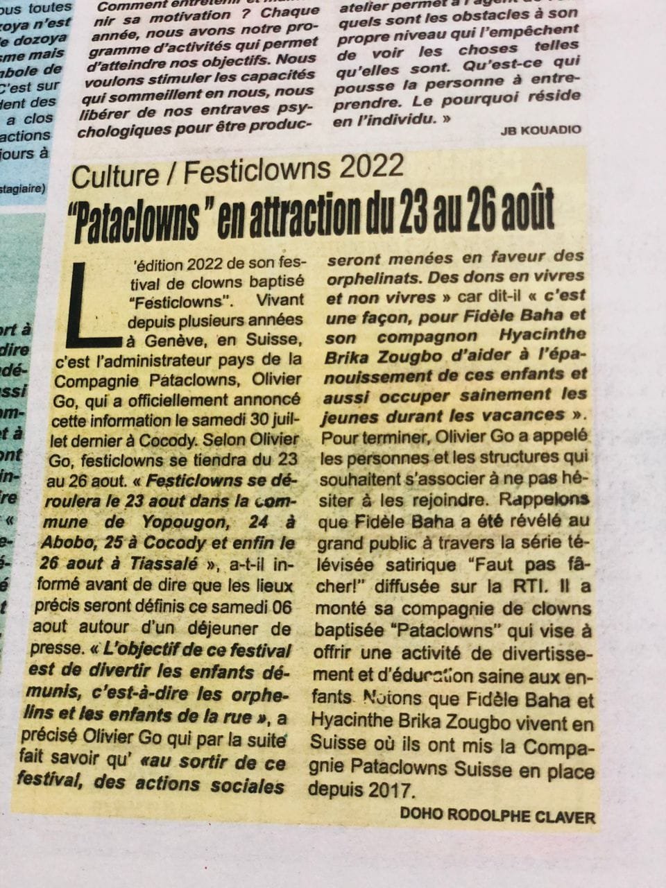 Le FESTICLOWNS, festival social et itinérant de spectacles pour la jeunesse en Côte d'Ivoire, est une initiative de l'association qui vise à apporter de la joie et du réconfort aux enfants des orphelinats.